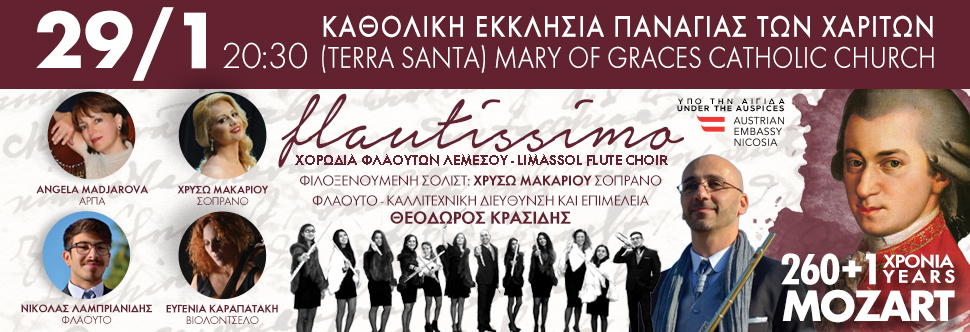 Μια μοναδική παράσταση αφιερωμένη στα 261α γενέθλια του μεγαλουργού Βόλφγκανγκ Αμαντέους Μότσαρτ, με δικά του εκλεκτά αριστουργήματα και διάφορους συνδυασμούς φλάουτου, βιολοντσέλου, άρπας και φωνής, σε μια σύμπραξη της Χορωδίας Φλάουτων Λεμεσού Flautissimo με προσκεκλημένους μουσικούς από το εξωτερικό. Η διακεκριμένη αρπίστρια Άντζελα Ματζάροβα θα προσκληθεί από τη Σόφια και η γνωστή Κύπρια Σοπράνο Χρύσω Μακαρίου από τη Βιέννη.