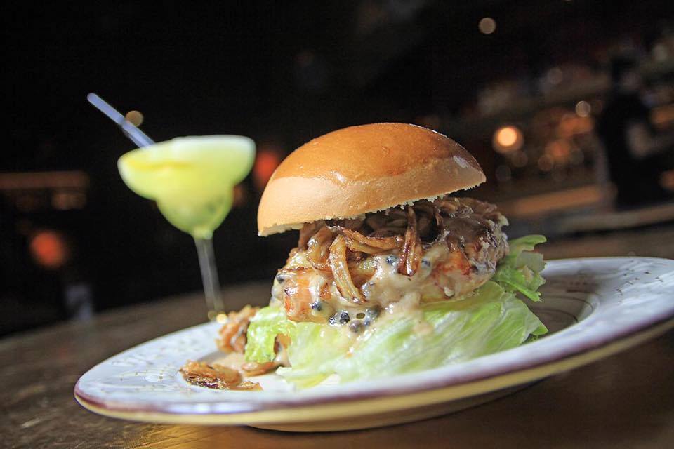 Prawn BurgerΜπέργκερ απο γαρίδες με κρεμώδες σάλτσα πιπεριών και σπιτικά τραγανά κρεμμυδάκια.
