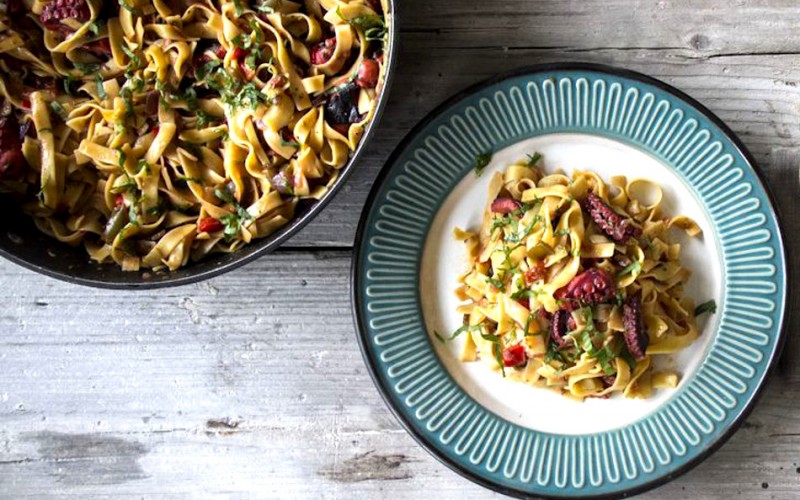 Βάλτε το χταπόδι σε μία κατσαρόλα με λίγο νερό (1 μεγάλο ποτήρι) και αφήστε το να πάρει μια βράση. Μόλις πάρει την πρώτη βράση, ρίξτε στην κατσαρόλα το ξίδι. Χαμηλώστε τη φωτιά και αφήστε το χταπόδι να μαγειρευτεί για 20 περίπου λεπτά. Προσθέστε το κόκκινο κρασί και βράστε το χταποδι μέχρι να μαλακώσει. Θυμηθείτε να κρατήσετε το ζουμί, για να βράσετε σ’ αυτό το κοφτό μακαρονάκι!Τσιγαρίστε το κρεμμύδι σε μια κατσαρόλα. Μόλις γίνει διάφανο, προσθέστε το χταπόδι. Αφήστε το να πάρει μια βράση και σβήστε το με το κόκκινο κρασί. Αλατοπιπερώστε , βάλτε στην κατσαρόλα, τα μπαχαρικά, τις τομάτες και τον πελτέ και αφήστε το χταπόδι να βράσει μ’ αυτά για πέντε λεπτά.Τέλος, βάλτε τα μακαρόνια μαζί με λίγο απ’ το νερό που κρατήσατε απ’ το μαγείρεμα του χραποδιού–προσέξτε να μην βάλετε περισσότερο απ’ όσο χρειάζεται για βράσουν, γιατί στο τέλος δεν θα τα σουρώσετε. Μαγειρέψτε τα όλα μαζί μέχρι να βράσουν τα μακαρόνια (10-13 λεπτά).