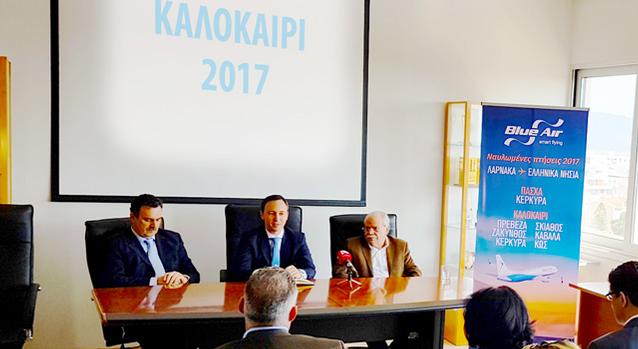 Η αεροπορική εταιρεία Blue Air δραστηριοποιείται στην Κύπρο από το 2008, με πτήσεις από και προς την Αθήνα και την Θεσσαλονίκη, το Βουκουρέστι και το Λονδίνο (Λούτον), το Μπέρμιγχαμ από 26 Μαρτίου 2017, το Κλουζ-Ναπόκα (Τρανσυλβανία) από 9 Απριλίου 2017 και το Λίβερπουλ από 16 Ιουνίου 2017.