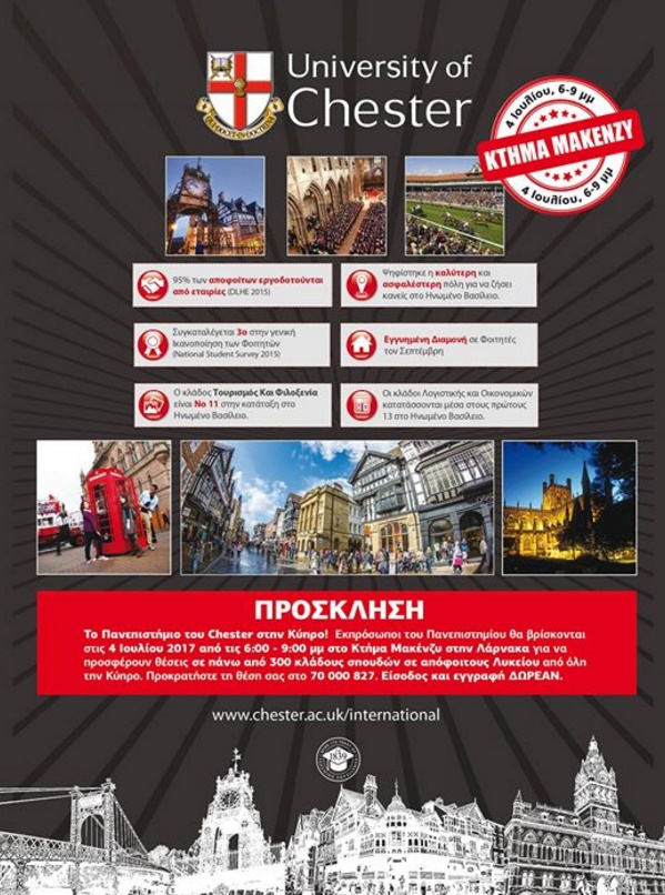 Το University of Chester, το αρχαιότερο Πανεπιστήμιο του Ηνωμένου Βασιλείου μετά το Oxford, Cambridge και Durham και ένα από τα καλύτερα Πανεπιστήμια Παγκοσμίως θα βρίσκεται στις 4 Ιουλίου από τις 6:00μμ-9:00μμ στο Κτήμα Μακένζυ στην Λάρνακα για να προσφέρει θέσεις σε περισσότερους από 350 κλάδους σπουδών σε τελειόφοιτους μαθητές Λυκείων και Ιδιωτικών Σχολών.