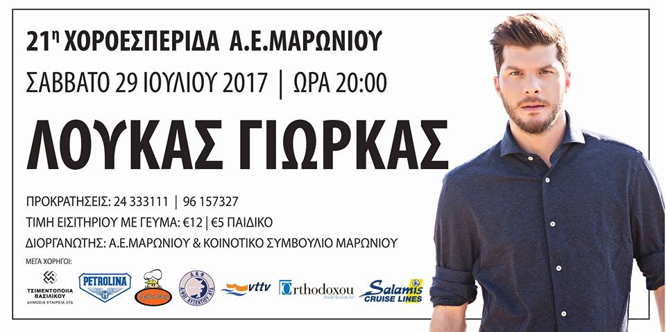 Ημερομηνίες: 29/07/2017 20:00 pm – 30/07/2017 Τοποθεσία Πλατεία Σωματείου Α.Ε.Μαρωνίουυ