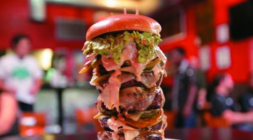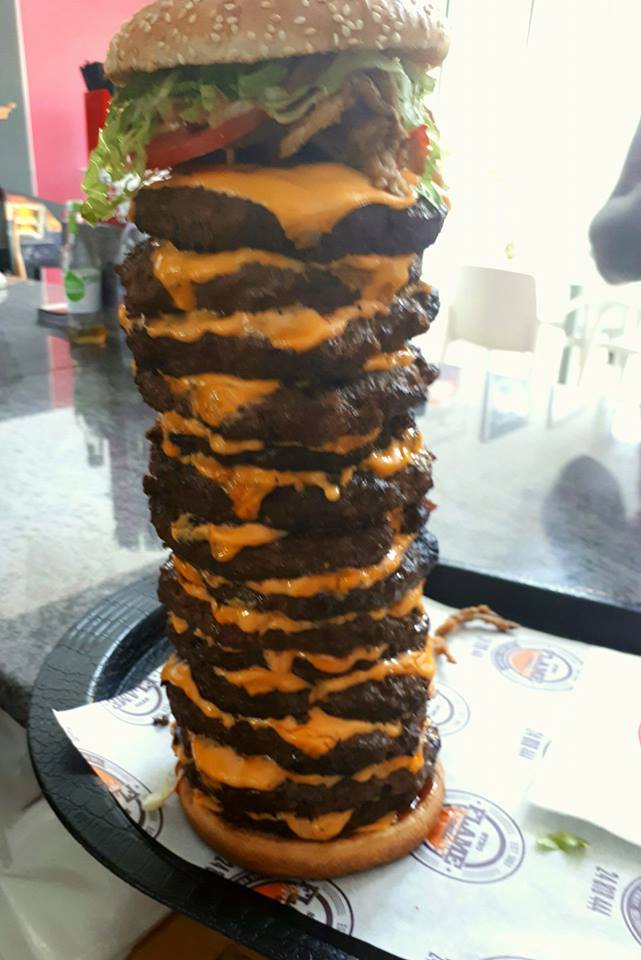 Οι ιδιοκτήτες δέχτηκαν την πρόκληση δημιουργώντας έναν πύργο burger 3 κιλών, αποτελούμενο από 14 βοδινά μπιφτέκια, τυρί, σαλάτα και δύο ψωμάκια.