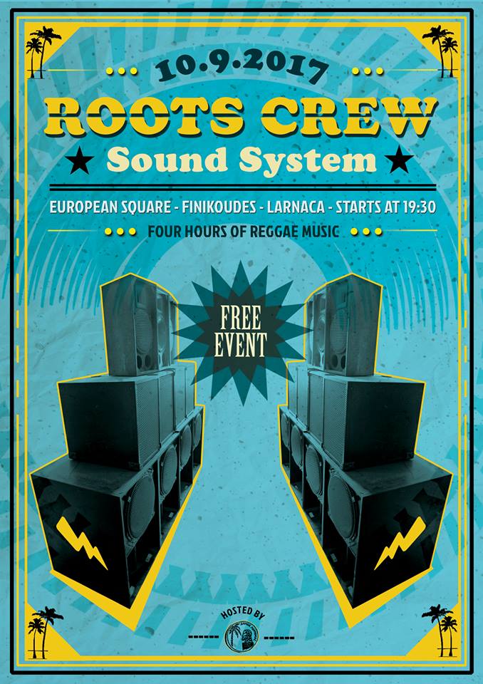Μετά από πολύ καιρό το Roots Crew Soundsystem θα εγκαταστήσει το ηχοσύστημα του για πρώτη φορά στη Πλατεία Ευρώπης στις Φοινικούδες. Η εκδήλωση θα πραγματοποιηθεί τη Κυριακή 10 Σεπτεμβρίου από τις 7:30 μ.μ μέχρι τις 10:30 μ.μ .