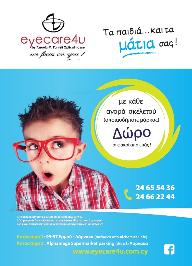 Για ακόμη μια χρονιά, το εξειδικευμένο προσωπικό των Eyecare 4 U,με την πολυετή του πείρα στον τομέα των οπτικών, θα είναι στην διάθεση σας για να σας δώσει τις κατάλληλες συμβουλές για τα παιδιά μας. Επισκεφθείτε μας στα 2 μας καταστήματα στην Λάρνακα ή καλέστε μας στο 24655436 ή 24662244.