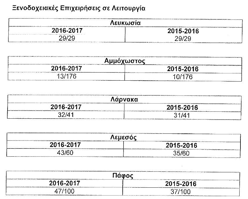 Σύμφωνα με στοιχεία του Κυπριακού Οργανισμού Τουρισμού (ΚΟΤ), την περίοδο Νοεμβρίου – Μαρτίου 2015/2016 παρέμειναν ανοιχτές 142 ξενοδοχειακές μονάδες από τις συνολικά 406 που λειτουργούν παγκύπρια. Την ίδια ώρα, την αντίστοιχη περίοδο του 2016/2017 παρέμειναν ανοικτά επιπλέον 22 ξενοδοχεία (164 από τα 406). Αξίζει να σημειωθεί ότι οι περισσότερες ξενοδοχειακές μονάδες που παρέμειναν ανοικτές αφορούν την Πάφο και την Λεμεσό.