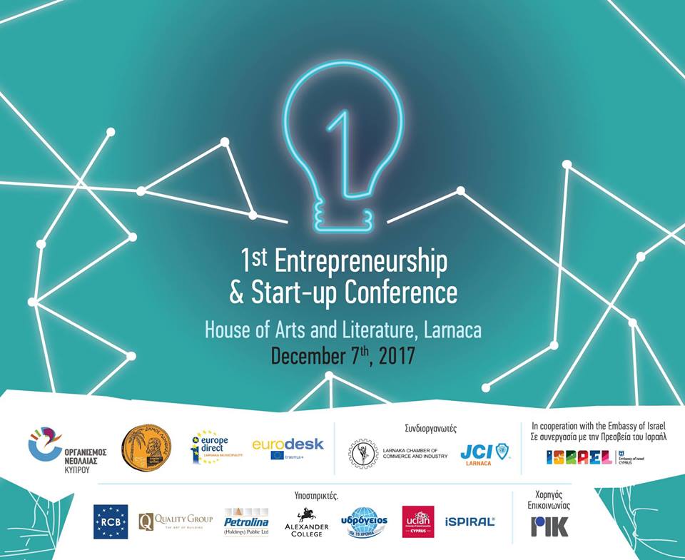 Ο Δήμος Λάρνακας, το Κέντρο Πληροφόρησης Europe Direct, ο Οργανισμός Νεολαίας Κύπρου, το Εμπορικό και Βιομηχανικό Επιμελητήριο Λάρνακας, το Διεθνές Επιμελητήριο Νέων Λάρνακας και το Eurodesk, σε συνεργασία με τη Πρεσβεία του Ισραήλ στην Κύπρο, σας προσκαλούν στο 1ο συνέδριο για την Επιχειρηματικότητα και τις Νεοφυείς Επιχειρήσεις που διοργανώνεται στην Λάρνακα την Πέμπτη, 7 Δεκεμβρίου 2017 και ώρα 9:30 π.μ – 16:00 μ.μ στο αναπαλαιωμένο κτήριο της πρώην Οθωμανικής Τράπεζας, στην Πλατεία Βασιλέως Παύλου, έναντι Μουσείου Πιερίδη και Περιπτέρου ΚΟΤ,