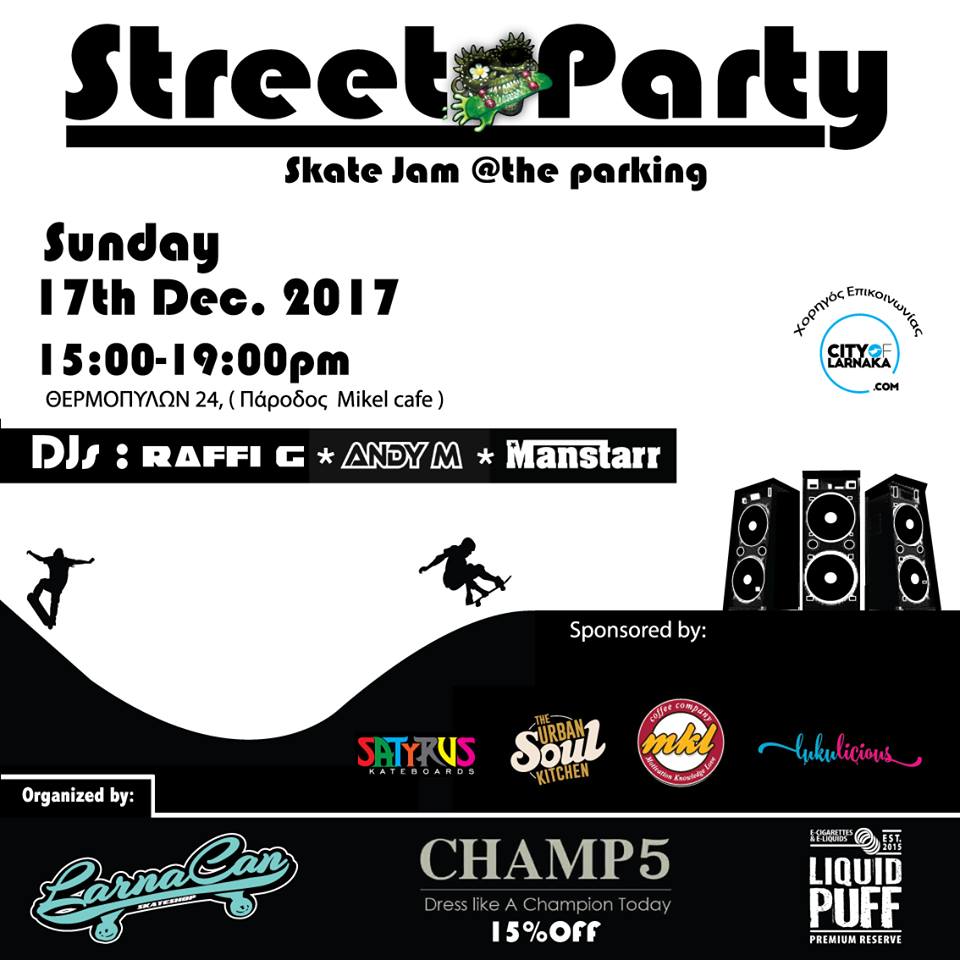 Παιδιά, αυτή την Κυριακή πάρτε τις σανίδες σας και ελάτε σένα φαντασμαγορικό Christmas Street Party. Τρία καταστήματα (LarnaCan, Champ5, Liquid Puff) που βρίσκονται στην Οδο Θερμοπυλων ενώνουν τις ιδέες τους και διοργανώνουν ένα πάρτη έτοιμο να ανεβάσει την αδρεναλίνη μας.