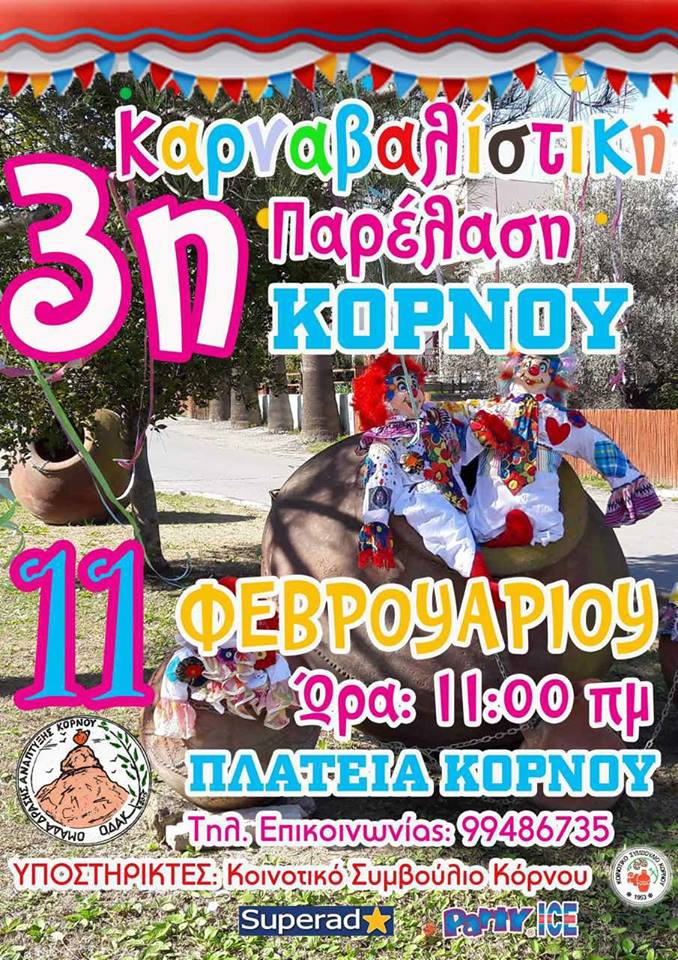 Ο Κόρνος μας για τρίτη συνεχή χρονιά θα υποδεχτεί το Καρναβάλι!!! Η Καρναβαλίστικη παρέλαση στα δρομάκια της Κοινότητας μας είναι και πάλι γεγονός!!! Μασκαρευτείτε, φορέστε το Χαμόγελό σας και σας περιμένουμε με πολύ κέφι!!!