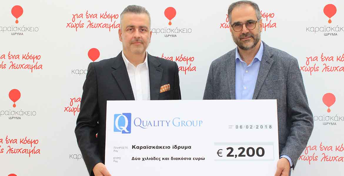 H Quality Group για ακόμη μια φορά απέδειξε την κοινωνική της προσφορά. Δώρησε το χρηματικό ποσό των 2.200 ευρώ στο Καραϊσκάκειο Ίδρυμα