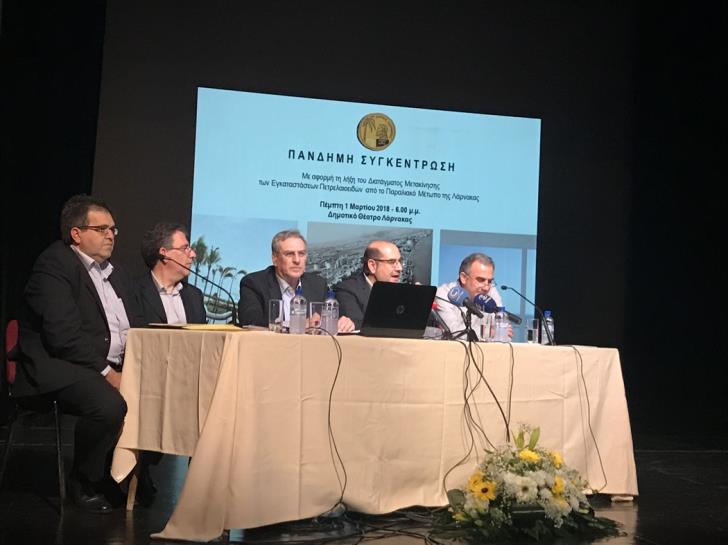 Οι αποφάσεις λήφθηκαν κατά τη διάρκεια πάνδημης συγκέντρωσης που έγινε στο Δημοτικό Θέατρο Λάρνακας με αφορμή τη σημερινή λήξη του Διατάγματος μετακίνησης των εγκαταστάσεων αποθήκευσης πετρελαιοειδών  και υγραερίου από το παραλιακό της μέτωπο. Στη συγκέντρωση παρευρέθηκαν οι βουλευτές Λάρνακας και βουλευτές Αμμοχώστου, πρώην Δήμαρχοι της Λάρνακας, Δημοτικοί σύμβουλοι, εκπρόσωποι κομμάτων, μέλη της Επιτροπής Ανάπτυξης της πόλης και αρκετός κόσμος.