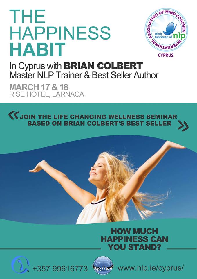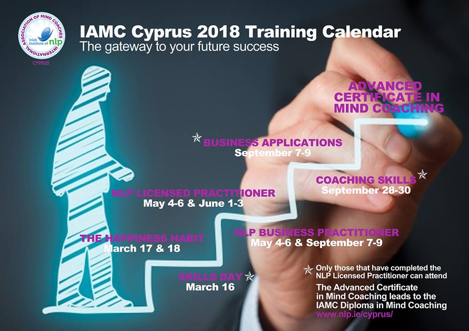 Το  International Association of Mind Coaches Cyprus ξεκίνησε τη λειτουργία του εδώ και τρία χρόνια περίπου με κεντρική περιοχή την πόλη της Λάρνακας και διοργανώνει αυτή την εβδομάδα στις 17 με 18 Μαρτίου το σεμινάριο “The Happiness Habit” στο Rise Hotel. Ο οργανισμός αυτός είναι διεθνούς εμβέλειας και συνάμα κάτι  πρωτοπόρο για τα δεδομένα της κυπριακής κοινωνίας , καθώς τα προγράμματα που προσφέρει θέλουν να βοηθήσουν με ένα τρόπο διαφορετικό τον κάθε , επιχειρηματία, νέο , γονείς , δασκάλους , γιατρούς και διάφορα άλλα άτομα από όλους τους τομείς, στο να χειριστούν καταστάσεις, αλλά ακόμα και να επιδιώξουν την επίτευξη των ίδιων τους των στόχων με τρόπους που στηρίζονται σε μια απλή και ξεκάθαρη μεθοδολογία μέσω του NLP programming.
