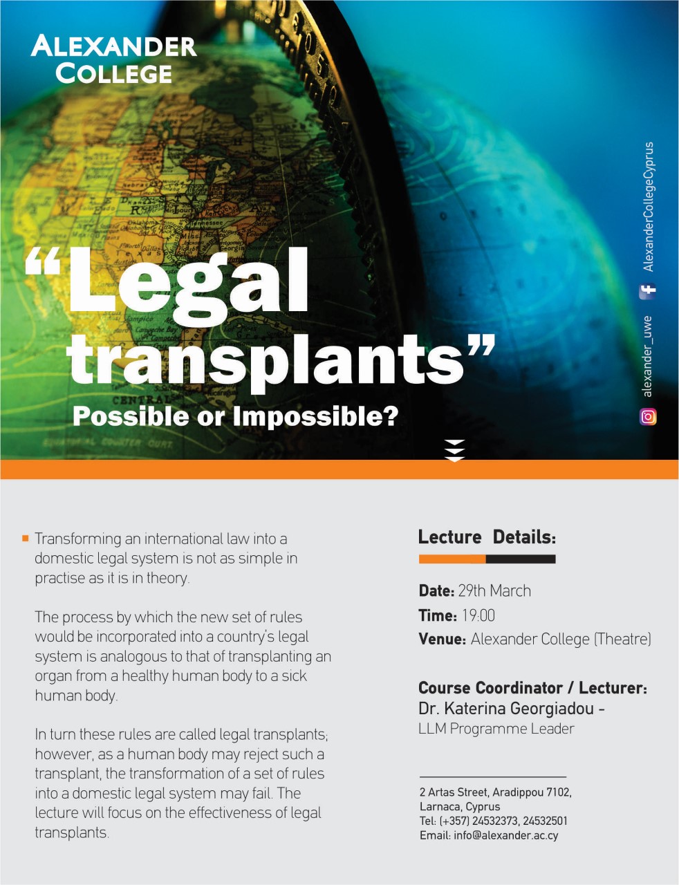 Ο Μεταπτυχιακός κλάδος σπουδών της Νομικής του Alexander College/UWE Bristol διοργανώνει διάλεξη που αφορά νομικούς και φοιτητές νομικής, με θέμα “Legal transplants” με ομιλήτρια την Δρ Κατερίνα Γεωργιάδου, υπεύθυνη καθηγήτρια του κλάδου LLM Commercial Law.