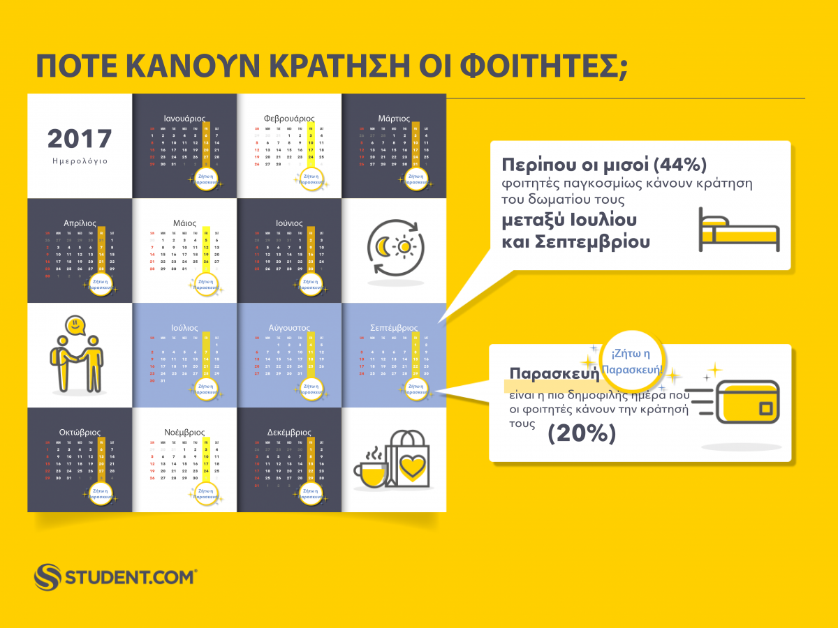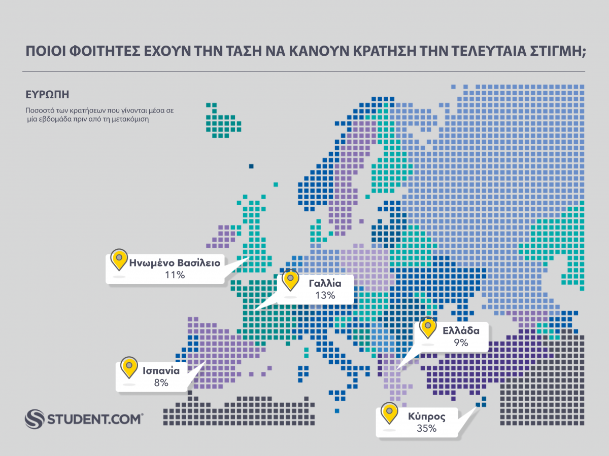 Πρωτιά φαίνεται να έχουν οι Κύπριοι φοιτητές αναφορικά  με τις κρατήσεις διαμονής σχετικά με το χρόνο που πραγματοποιούν την κράτησή τους αλλά και το πότε μετακομίζουν, αφού το 35% από αυτούς έκλεισαν τη φοιτητική τους διαμονή μόλις μία εβδομάδα πριν τη μετακόμισή τους.
