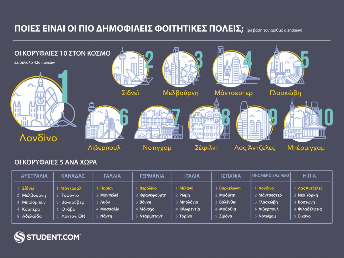 Τη δημοφιλέστερη φοιτητική πόλη αποτελεί το Λονδίνο με το Σίδνεϊ, τη Μελβούρνη και το Μάντσεστερ να ακολουθούν στη σειρά κατάταξης.