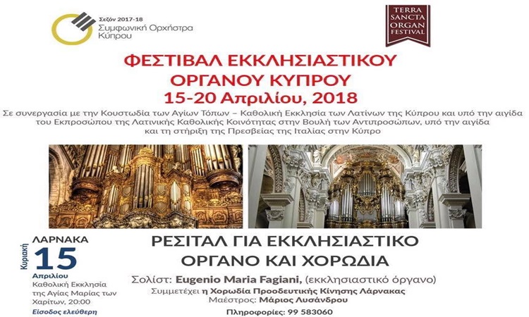 Το Ίδρυμα Συμφωνική της  Ορχήστρας Κύπρου & το Φεστιβάλ Εκκλησιαστικού Οργάνου Terra Sancta, παρουσιάζουν το Φεστιβάλ Εκκλησιασιτκού Οργάνου Κύπρου “Ρεσιτάλ για εκκλησιαστικό όργανο και χορωδία”  την Κυριακή 15 Απριλίου 2018 , στην Καθολική Εκκλησία της Αγίας Μαρίας των Χαρίτων, στις 20:00.