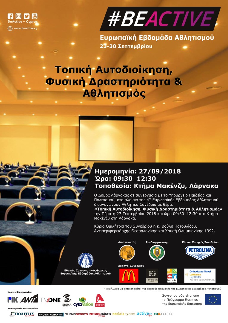Οι δύο μεγαλύτερες και καινοτόμες δράσεις του Δήμου Λάρνακας για την 4η Ευρωπαϊκή Εβδομάδα Αθλητισμού είναι η πραγματοποίηση του Αθλητικού Συνεδρίου «Τοπική Αυτοδιοίκηση, Φυσική Δραστηριότητα & Αθλητισμός» όπου κύρια Ομιλήτρια θα είναι η κ. Βούλα Πατουλίδου, Αντιπεριφερειάρχης Θεσσαλονίκης και Χρυσή Ολυμπιονίκης 1992 και η διεξαγωγή της δράσης #BeActive Night, η οποία θα πραγματοποιηθεί στην Πλατεία Ευρώπης και συμπεριλαμβάνει ποδηλασία, τρέξιμο 5km, αθλητικές επιδείξεις, Beach Tennis, Fitness Marathon και άλλα