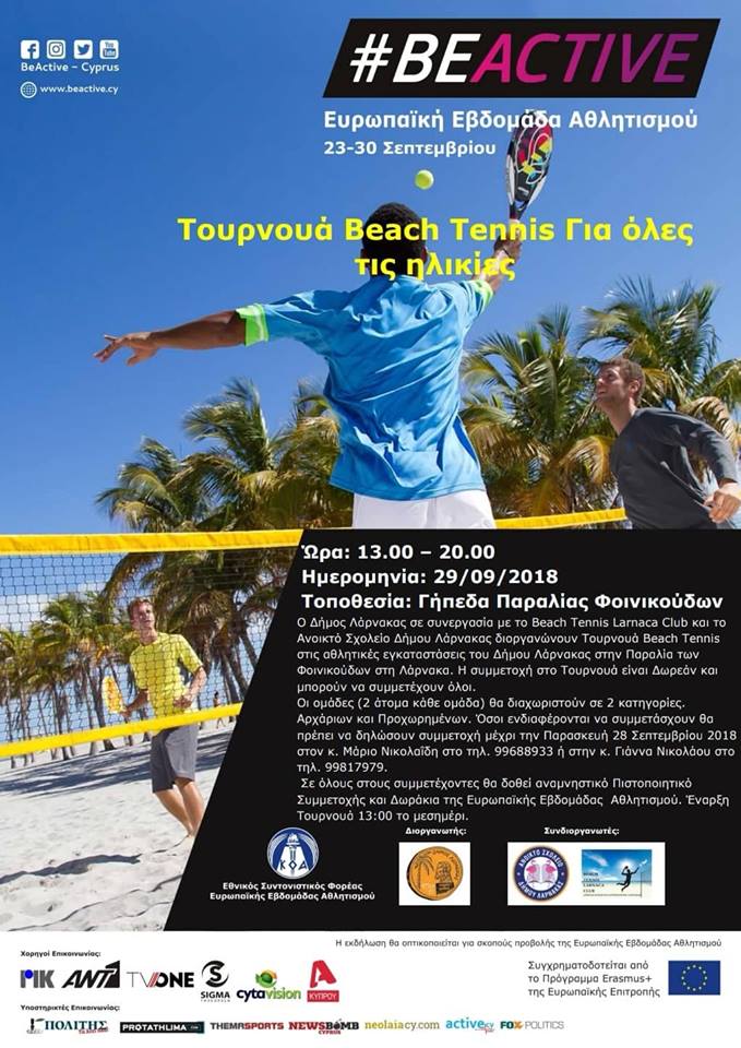 Από τις 1:00μ.μ – 8:00 θα διεξάγεται Τουρνουά Beach Tennis στις αθλητικές εγκαταστάσεις του Δήμου Λάρνακας  στις Φοινικούδες.