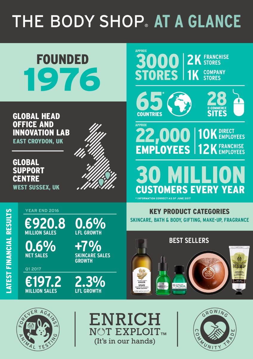 Τώρα έχουμε πάνω από 3.000 καταστήματα σε 66 χώρες και απασχολούν περισσότερους από 22.000 ανθρώπους που μας βοηθούν να φέρουμε τον μοναδικό συνδυασμό ηθικής ομορφιάς με αίσθηση χιούμορ και σοβαρό σκοπό στον κόσμο. Ποτέ μην φοβάσαι να ξεχωρίζεις από το πλήθος και να σηκώνεις το σωστό, ψάχνουμε στον κόσμο για τα καλύτερα συστατικά από ηθικής προέλευσης για να δημιουργήσουμε μια σειρά από προϊόντα ομορφιάς εμπνευσμένα από τη φύση. Σήμερα, η αφοσίωσή μας στη χρήση των επιχειρήσεων ως δύναμη για καλό είναι ισχυρότερη από ποτέ.