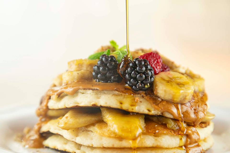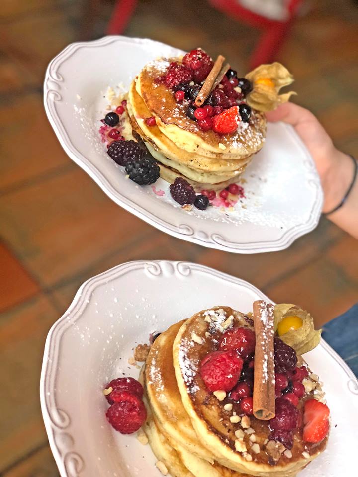 Vegan Pancakes με γάλα αμυγδάλου, μούρα, σιρόπι σφενδάμου και καβουρδισμένα φουντούκια.