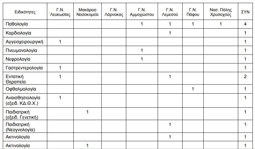 Γίνεται δεκτή η υποβολή αιτήσεων για τριάντα τρεις (33) κενές θέσεις Ιατρικών Λειτουργών, Οργανισμού Κρατικών Υπηρεσιών Υγείας, στις πιο κάτω ειδικότητες, υπό την αίρεση ψήφισης του Προϋπολογισμού 2019 του Οργανισμού Κρατικών Υπηρεσιών Υγείας από τη Βουλή των Αντιπροσώπων:
