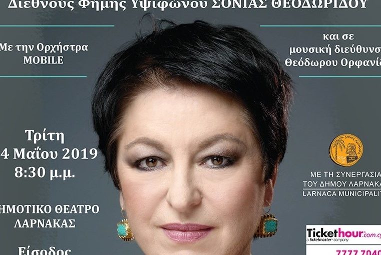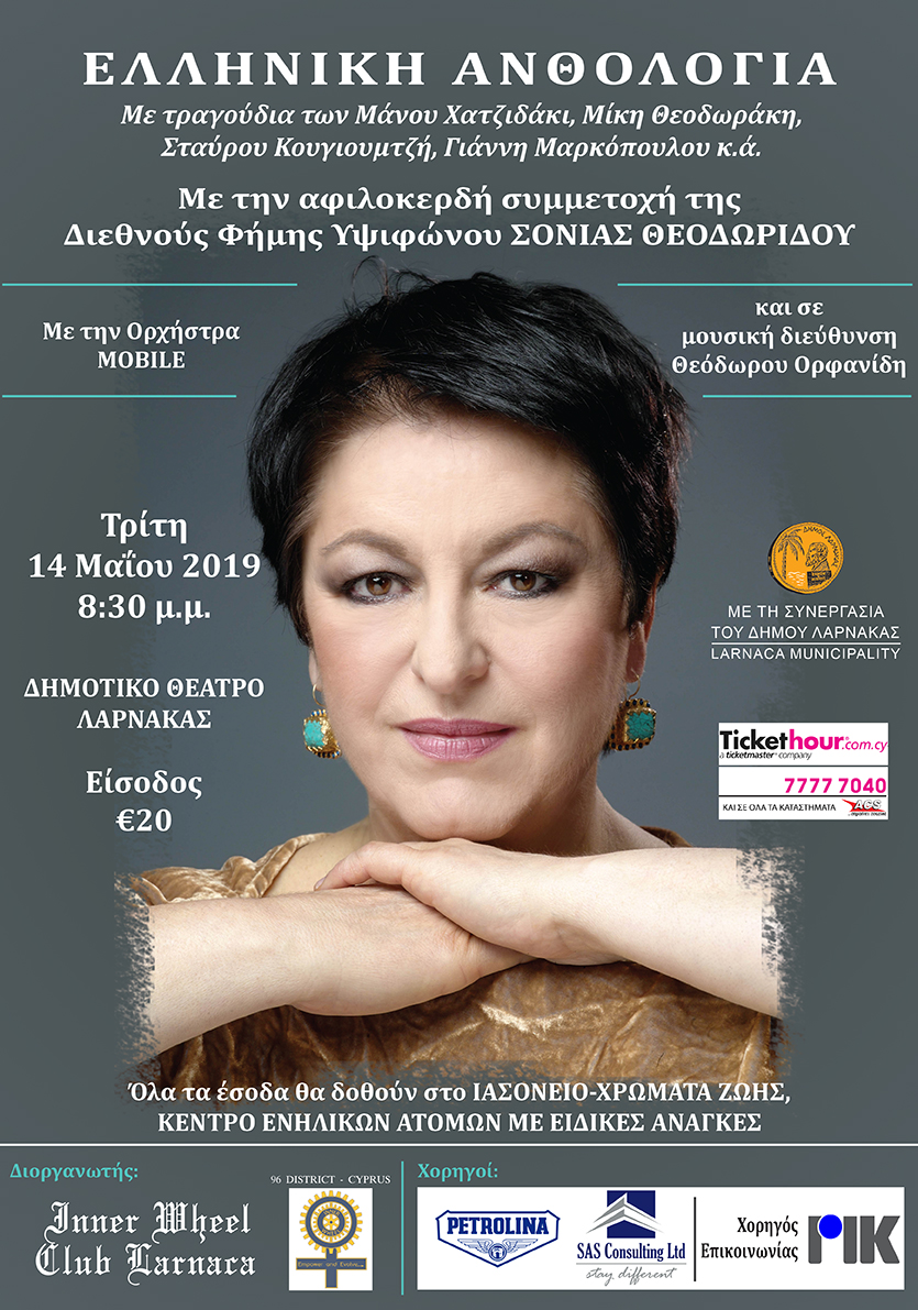 Το Inner Wheel Club Larnaca διοργανώνει Μουσική Παράσταση με τίτλο «Μουσική Ανθολογία», την Τρίτη 14 Μαΐου 2019, και ώρα 8:30 μ.μ. στο Δημοτικό Θέατρο Λάρνακας, με τραγούδια του Μάνου Χατζηδάκι, Μίκη Θεοδωράκη, Σταύρου Κουγιουμτζή, Γιάννη Μαρκόπουλου κ.ά, με τη συμμετοχή της Διεθνούς Φήμης Υψιφώνου Σόνιας Θεοδωρίδου και με την Ορχήστρα Μόμπιλε, σε μουσική Διεύθυνση Θεόδωρου Ορφανίδη.