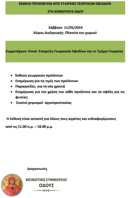 Το Κοινοτικό Συμβούλιο Οδού, πραγματοποιεί αύριο Σάββατο 11 Μαίου 2019 στην πλατεία του χωριού Οδού έκθεση προιόντων από εταιρείες γεωργικών εφοδίων.
