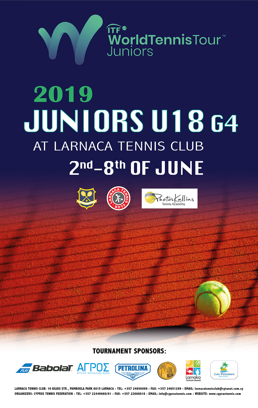 Το Διεθνές Πρωτάθλημα Tennis ITF JUNIORS Under -18 G4 είναι το τρίτο συνεχόμενο που πραγματοποιείται στην πόλη της Λάρνακας και θα διεξαχθεί μεταξύ 2 – 8 Ιουνίου 2019, στον Όμιλο Αντισφαίρισης Λάρνακας, αρχίζοντας από τους προκριματικούς αγώνες που θα πραγματοποιηθούν στις 2 και 3 Ιουνίου.