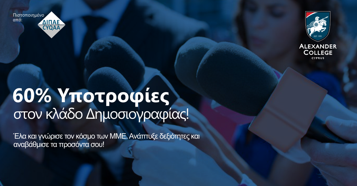 O Νέος κλάδος Δημοσιογραφίας υλοποιείται φέτος στο Alexander College αξιολογημένος-πιστοποιημένος απο τον Φορέα Διασφάλισης και Πιστοποίησης της ποιότητας της Ανώτερης Εκπαίδευσης ( ΔΙ.ΠΑ.Ε ).