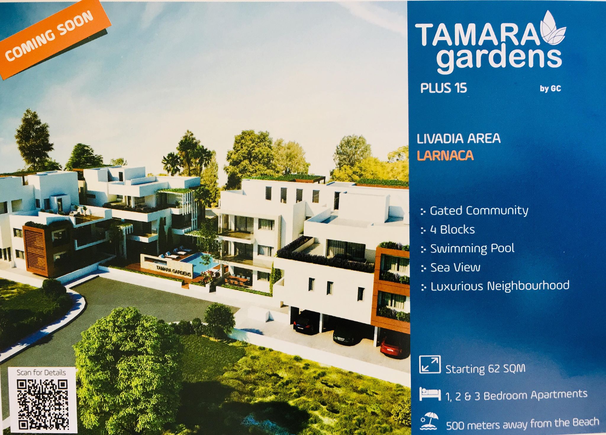 Το Tamara Gardens (Plus 15) είναι το νέο οικιστικό συγκρότημα της Plus Properties. To συγκρότημα περιβάλλεται από καταπράσινους χώρους, σε απόσταση 500 μέτρων από την παραλία σε μια από τις ωραιότερες περιοχές της Λάρνακας στην περιοχή Λιβαδιών.