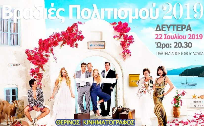 Οι πολιτιστικές βραδιές θα συνεχιστούν τη Δευτέρα 22 Ιουλίου με την προβολή της κινηματογραφικής ταινίας «ΜΑΜΜΑ ΜΙΑ 2» με τη Μέριλ Στριπ. Οι τίτλοι τέλους για τις Βραδιές Πολιτισμού 2019 θα πέσουν την Τετάρτη 24 Ιουλίου με τη θεατρική παράσταση «Οι μαννοί – Οι ηλίθιοι» του Νηλ Σάιμον από το θέατρο ΣΚΑΛΑ σε διασκευή και μετάφραση στην κυπριακή διάλεκτο Μιχάλη Ττερλικά.