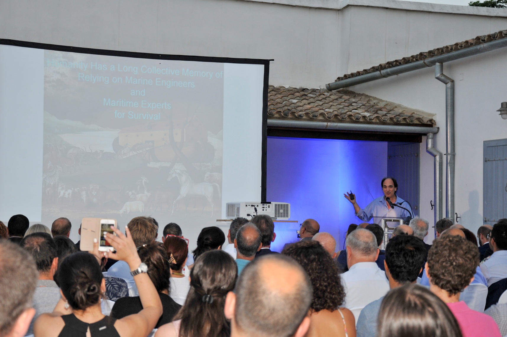 Ο επίτιμος ομιλητής της εκδήλωσης, καθηγητής του MIT, Δρ. Νικόλας Μακρής έκανε αρχικά μια ιστορική αναδρομή εξηγώντας την σημασία της θαλάσσιας μηχανικής στην διαχείριση των προκλήσεων που οι άνθρωποι αντιμετώπιζαν σε σχέση με τη θάλασσα. Μία ιδιαίτερη πρόκληση στην οποία επικεντρώθηκε ο Δρ. Μακρής είναι το λιώσιμο των πάγων και συνεπώς η αύξηση της στάθμης της θάλασσας –ως αποτέλεσμα της κλιματικής αλλαγής- η οποία έχει επιπτώσεις κι αναμένεται να επηρεάσει σε ακόμα μεγαλύτερο βαθμό τις παράκτιες πόλεις και τους πληθυσμούς τους. Η αντιμετώπιση της πρόκλησης αυτής πρόσθεσε ο Δρ. Μακρής ότι αποτελεί πλέον και προτεραιότητα για τον ΟΗΕ ο οποίος εξετάζει ολοένα και περισσότερο την πιθανότητα οικοδόμησης βιώσιμων πλωτών πόλεων σε συνεργασία με θαλάσσιους μηχανικούς παγκοσμίως. Στη συνέχεια εξήγησε πώς θα λειτουργούν οι πόλεις αυτές, δίνοντας έμφαση στο χαμηλό οικολογικό τους αποτύπωμα, ενώ τόνισε και την αναγκαιότητα της θαλάσσιας μηχανικής στην εξεύρεση τέτοιων λύσεων που θα διασφαλίζουν και θα βελτιώνουν τη ζωή των ανθρώπων.