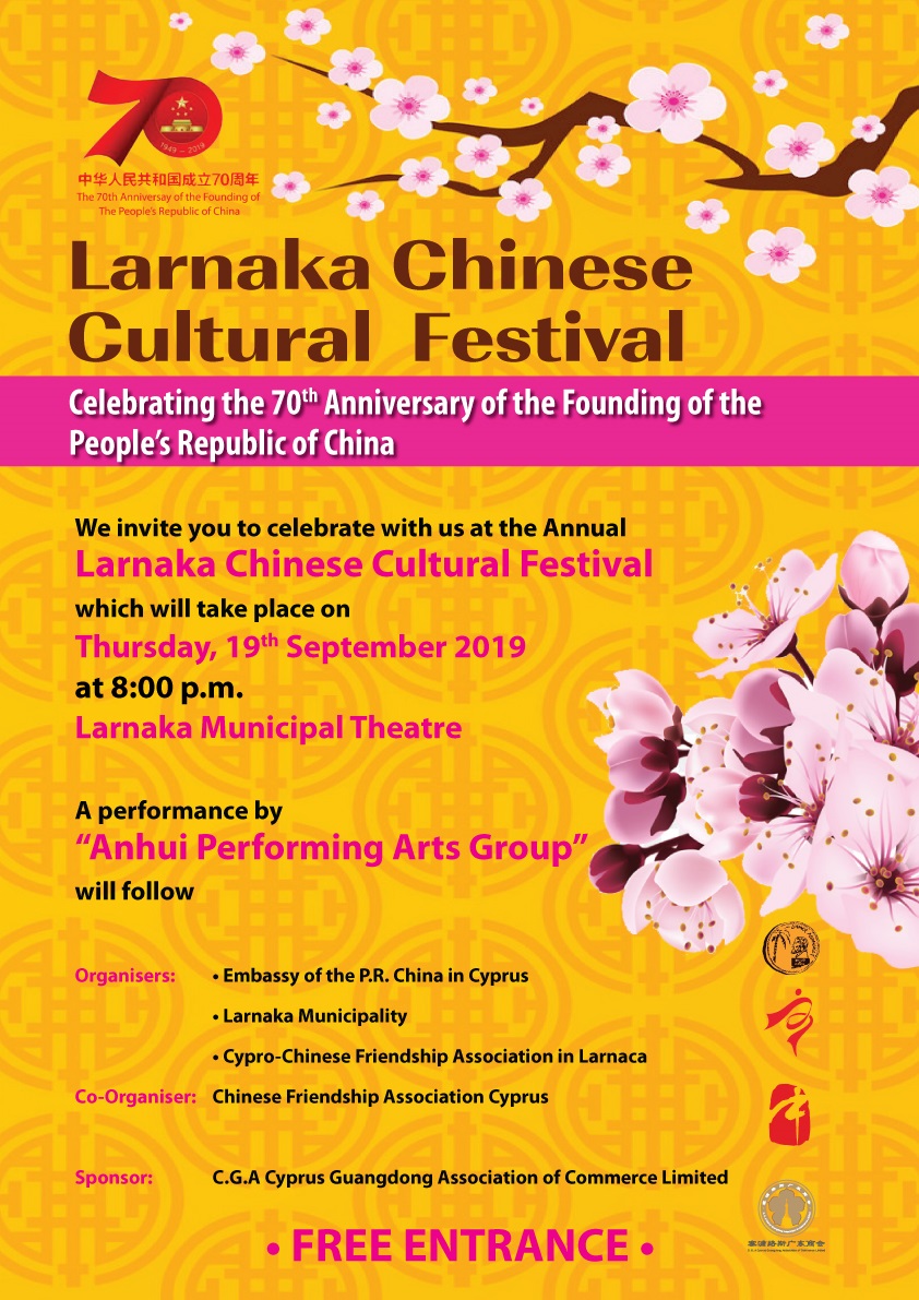 Το Φεστιβάλ θα πραγματοποιηθεί στο Δημοτικό Θέατρο Λάρνακας,  με την ευκαιρία της 70ης επετείου της ίδρυσης της Λ. Δ. της Κίνας «Anhui  Performing  Arts  Group από την Κίνα».