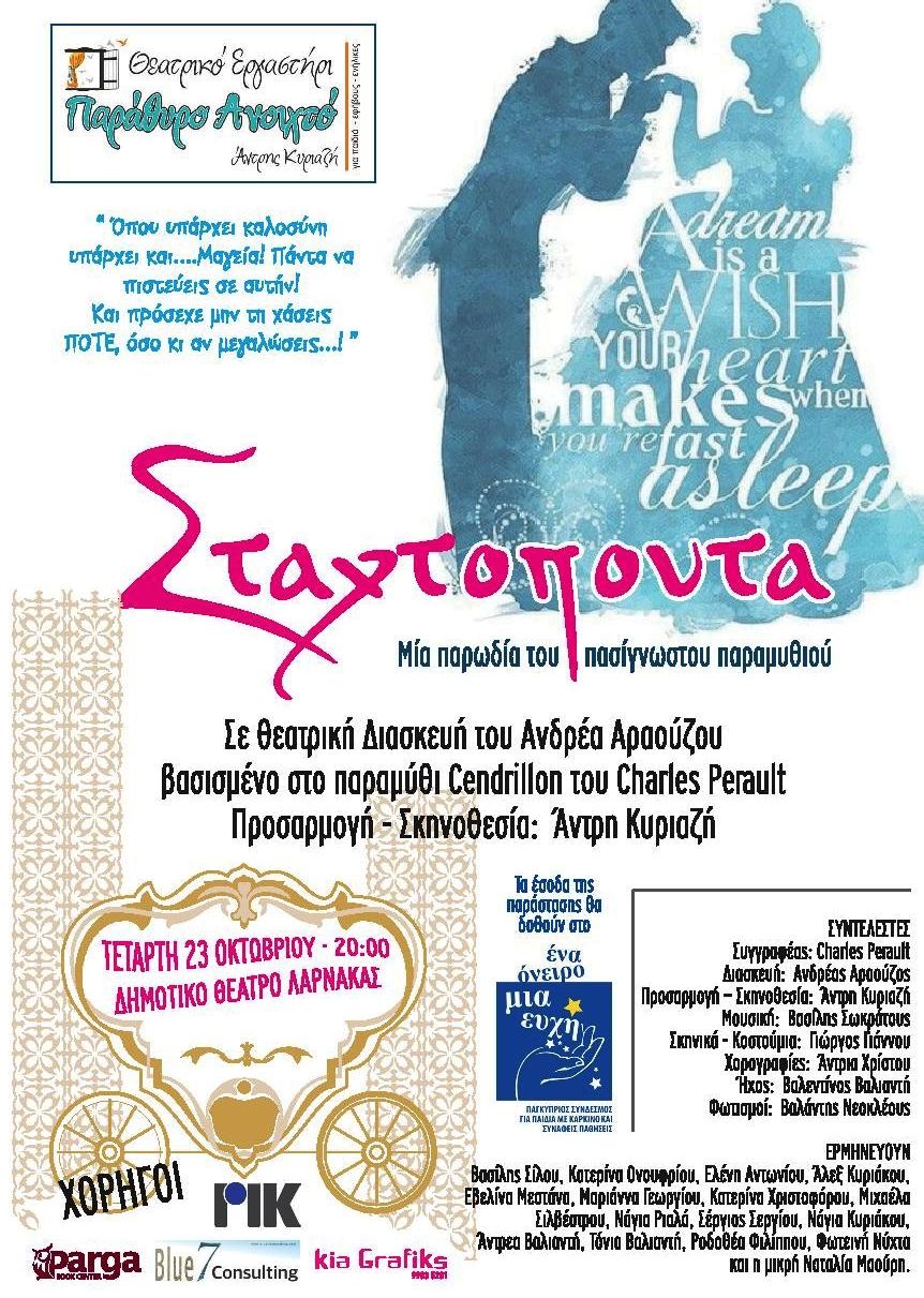 Αύριο Τετάρτη 23 Οκτωβρίου 2019 στις 8:00 μ. μ., στο Δημοτικό Θέατρο Λάρνακας, το Θεατρικό Εργαστήρι «Παράθυρο Ανοιχτό» ανεβάζει την παρωδία του παραμυθιού «Σταχτοπούτα» του Charles Perault.