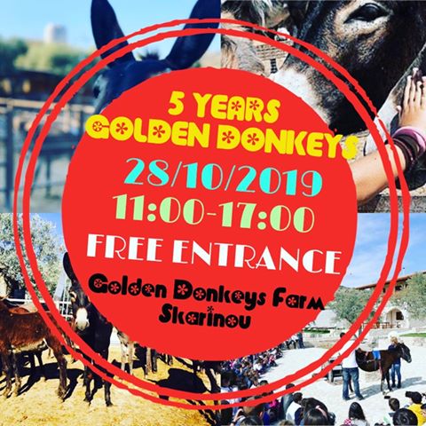 Εξ ου και τη Δευτέρα 28 Οκτώβρη μας περιμένουν όλους μαζί στην Golden Donkeys Farm στη Σκαρίνου για να γιορτάσουμε  τα 5 χρόνια λειτουργίας της. Από τις 11:00-17:00, με ελεύθερη είσοδο.