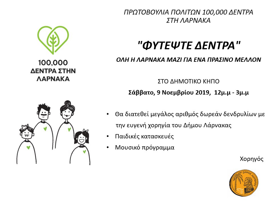 Η ομάδα πρωτοβουλίας πολιτών της Επαρχίας Λάρνακας με την ονομασία «100,000 δέντρα στη Λάρνακα» έχει συσταθεί σε συντονιστική επιτροπή με υποομάδες δράσης, με στόχο τον συντονισμό επικοινωνίας μεταξύ Κράτους, Τοπικών Αρχών, Τοπικών επιχειρήσεων, οργανωμένων ομάδων και δημοτών της πόλης και επαρχίας, για την δεντροφύτευση 100,000 δένδρων σε όλη την επαρχία ξεκινώντας από τώρα.