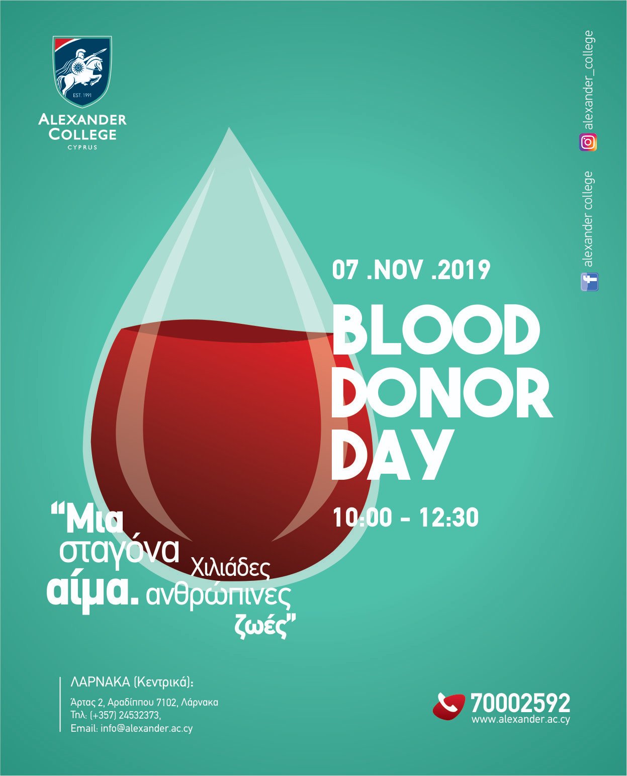 Tο Alexander College, σε συνεργασία με το Γενικό Νοσοκομείο Λάρνακας διοργανώνουν εθελοντική αιμοδοσία , στο χώρο του εκπαιδευτικού ιδρύματος. Η αιμοδοσία θα πραγματοποιηθεί την Πέμπτη 7 Νοεμβρίου 2019. Θα ξεκινήσει στις 10:00 π.μ. και θα ολοκληρωθεί στις 12:30 μ.μ.