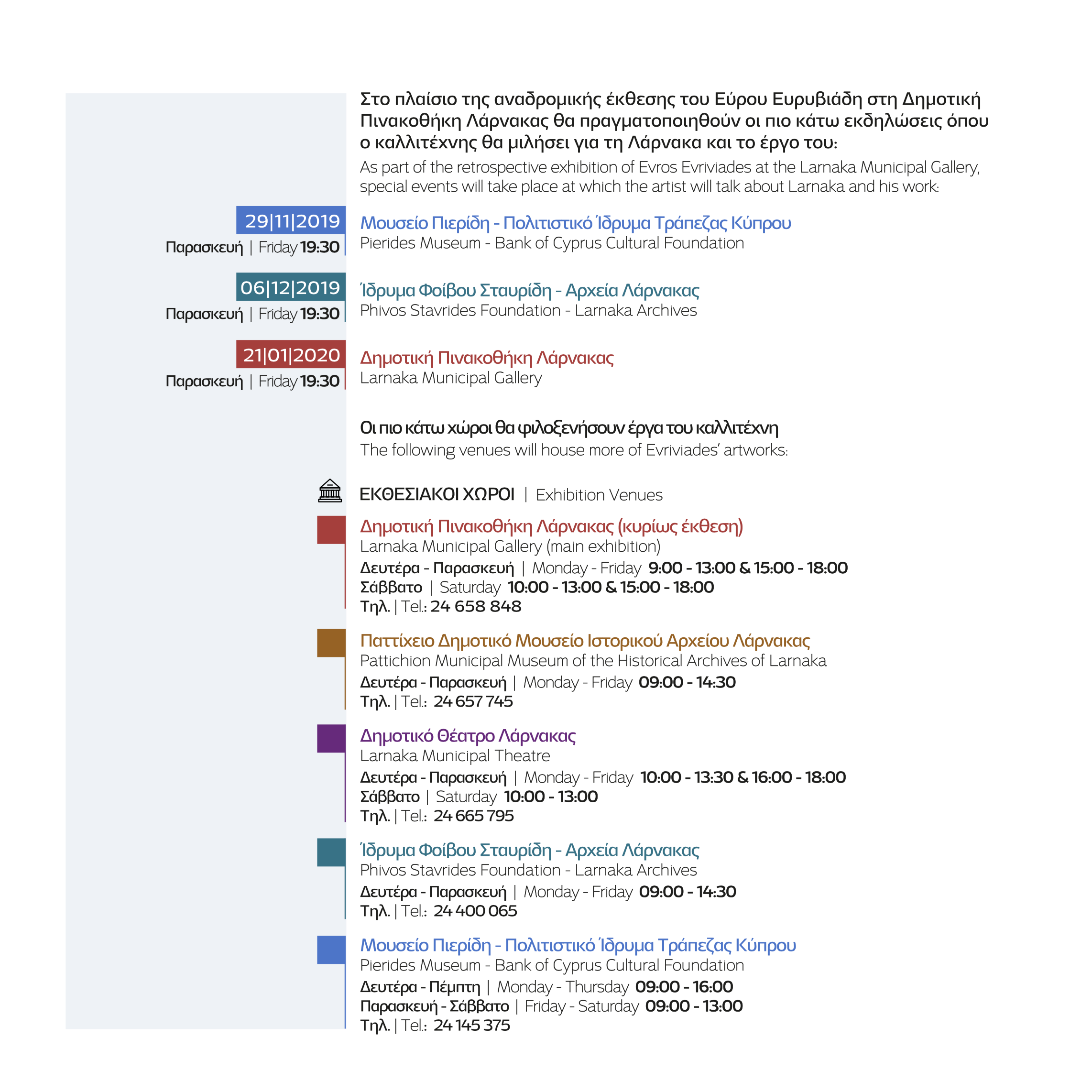 Ο Δήμος Λάρνακας στα πλαίσια των εικαστικών δραστηριοτήτων του για το έτος 2019, διοργανώνει την αναδρομική έκθεση του Λαρνακέα καλλιτέχνη Εύρου Ευρυβιάδη με τίτλο «Ευρυβιάδου 9».