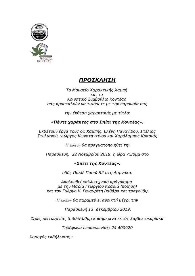 Το Μουσείο Χαρακτικής Χαμπή και το Κοινοτικό Συμβούλιο Κοντέας, διοργανώνουν την έκθεση χαρακτικής με τίτλο “Πέντε χαράκτες στο Σπίτι της Κοντέας”. Εκθέτουν έργας τους οι Χαμπής, Ελένη Παναγίδου, Στέλιος Στυλιανού, Γιώργος Κωνσταντίνου, Χαράλαμπος Κρασιάς.