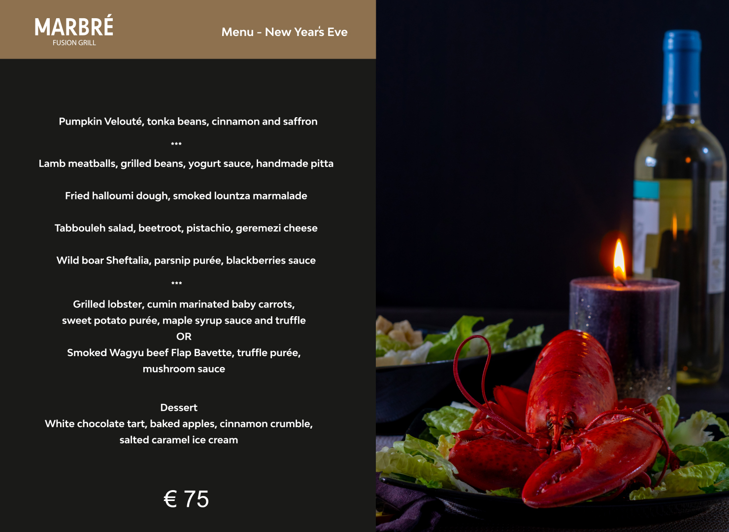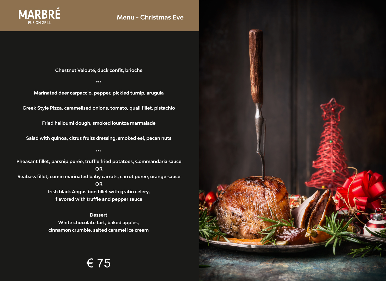 Συγκεκριμένα στο βραβευμένο με «Top Notch» Marbre Fusion Grill, ο executive chef Αλέξανδρος Τσιοτίνης δημιούργησε δύο άκρως εορταστικά set menus, ένα για Παραμονή Χριστουγέννων και ένα για Παραμονή Πρωτοχρονιάς.