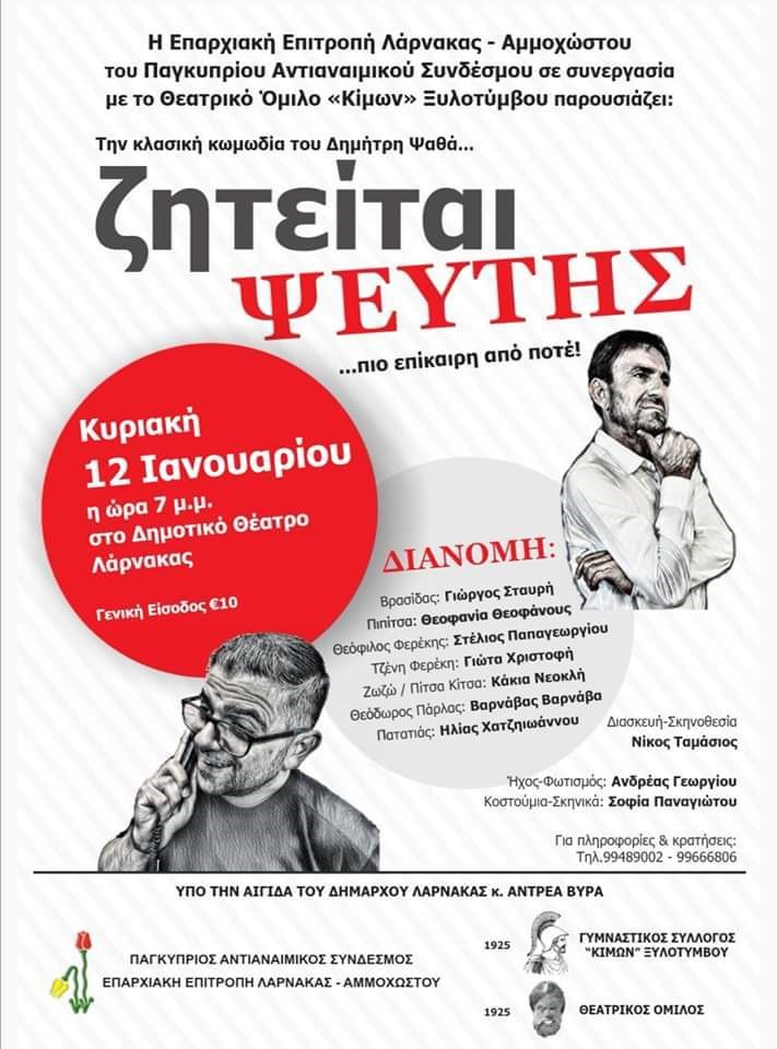 Η Επαρχιακή Επιτροπή Λάρνακας – Αμμοχώστου του Παγκύπριου Αντιαναιμικού Συνδέσμου, σε συνεργασία με το Θεατρικό Όμιλο “Κίμων” Ξυλοτύμβου, παρουσιάζει την κλασική κωμωδία του Δημήτρη Ψαθά “Ζητείται Ψεύτης”, την Κυριακή 12 Ιανουαρίου 2020 στις 7.00 μ.μ. στο Δημοτικό Θέατρο Λάρνακας.