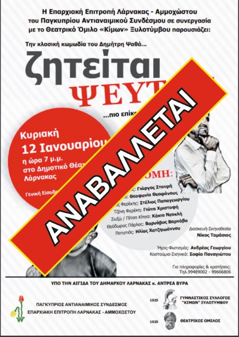 Η Επαρχιακή Επιτροπή Λάρνακας-Αμμοχώστου του Παγκύπριου Αντιαναιμικού Συνδέσμου, μετά λύπης ανακοινώνει την αναβολή της θεατρικής παράστασης που θα πραγματοποιόταν την Κυριακή 12 Ιανουαρίου 2020, λόγω  θεμάτων υγείας που απροόπτως αντιμετωπίζουν κάποια μέλη της θεατρικής ομάδας. Η νέα ημερομηνία πραγματοποίησης της παράστασης θα ανακοινωθεί τις αμέσως επόμενες μέρες.