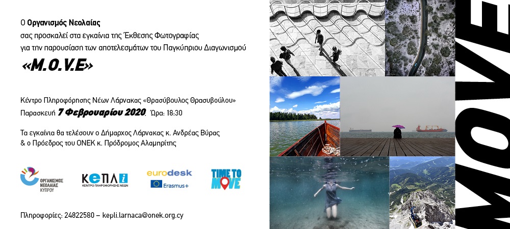 Η Έκθεση, η οποία έχει τίτλο «Move – Motivating Others through Voices of Experience» αποτελεί το επιστέγασμα του Φωτογραφικού Διαγωνισμού που διεξάχθηκε από 15 Οκτωβρίου μέχρι την 1η Δεκεμβρίου 2019. Στην Έκθεση θα παρουσιαστούν φωτογραφίες που βραβεύτηκαν αλλά και διακρίθηκαν στον διαγωνισμό, ο οποίος έγινε εις μνήμη του Θρασύβουλου Θρασυβούλου, τέως Εκτελεστικού Γραμματέα του Οργανισμού Νεολαίας, στα πλαίσια της ευρωπαϊκής ενημερωτικής εκστρατείας του «Τime to Move».