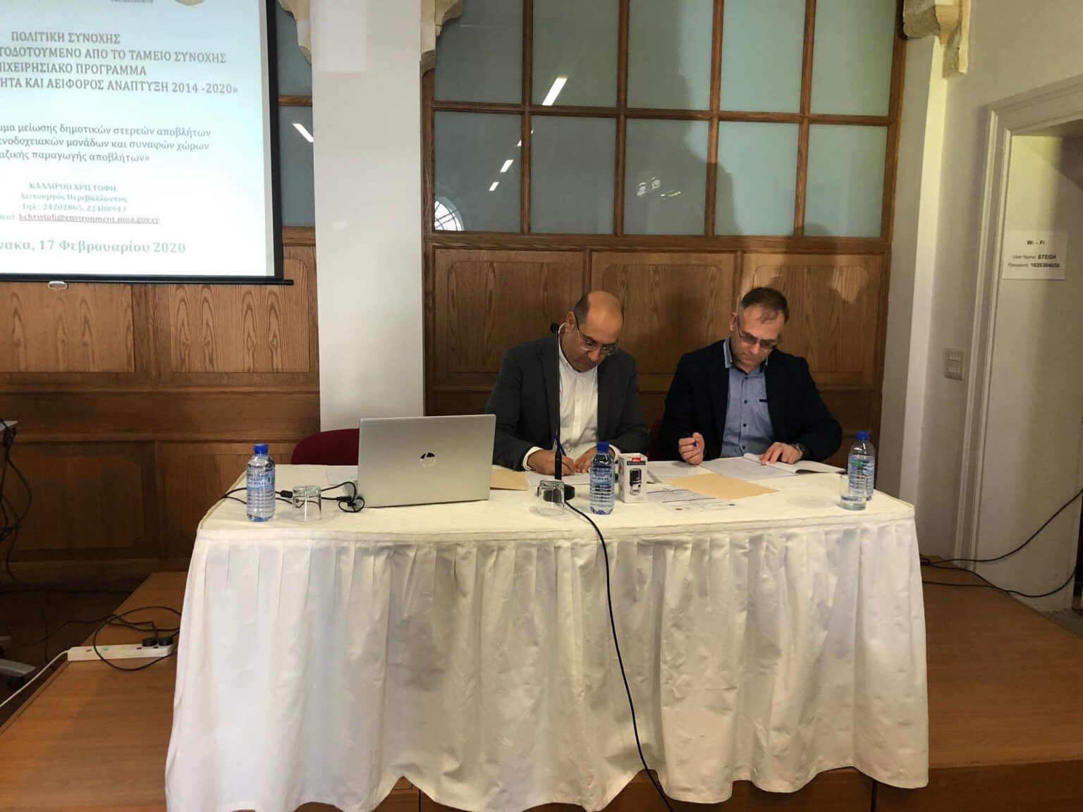 Πραγματοποιήθηκε τη Δευτέρα, 17 Φεβρουαρίου 2020, στη Στέγη Γραμμάτων και Τεχνών Λάρνακας, Ενημερωτική Ημερίδα με θέμα την μείωση στερεών δημοτικών αποβλήτων, παραλιακών ξενοδοχειακών μονάδων και πλησίον συναφών χώρων μαζικής παραγωγής αποβλήτων, στον Δήμο Λάρνακας.