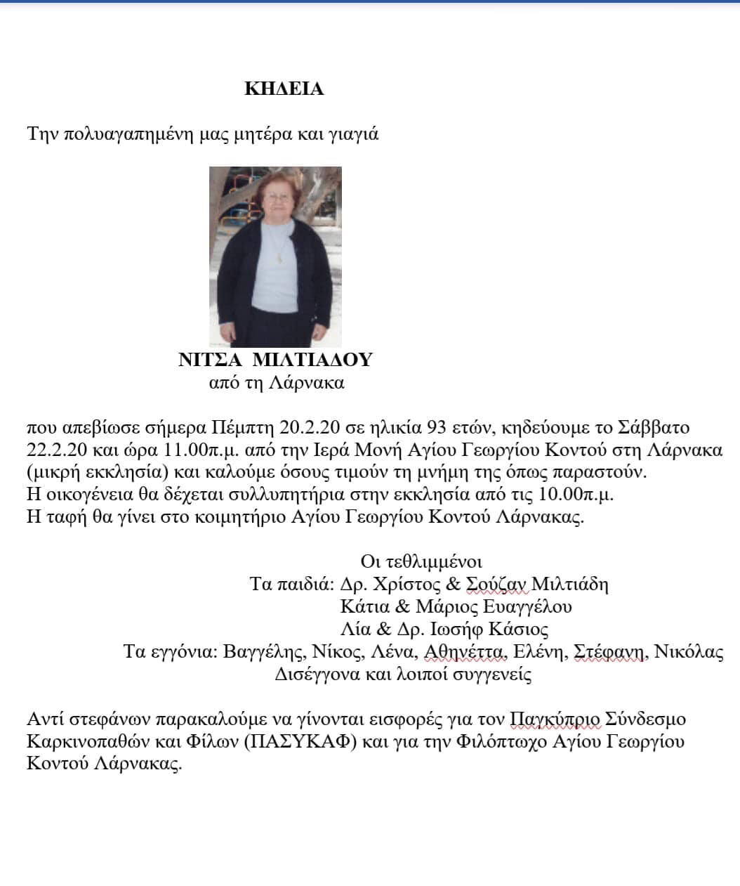 ”Όλη η οικογένεια της Αθλητικής Ένωσης Κίτιον (ΑΕΚ) Λάρνακας εκφράζει την βαθύτατη θλίψη της και τα θερμά της συλλυπητήρια στην οικογένεια και τους οικείους της Νίτσας Μιλτιάδους, για τον θάνατο της.