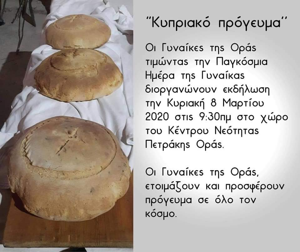 Οι Γυναίκες της Οράς τιμώντας την Παγκόσμια Ημέρα της Γυναίκας, διοργανώνουν εκδήλωση την Κυριακή 8 Μαρτίου 2020 στις 9.30 π. μ. στο χώρο του Κέντρου Νεότητας Πετράκης Οράς.