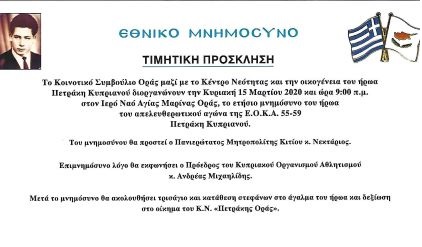 Το Κοινοτικό Συμβούλιο Οράς, μαζί με το Κέντρο Νεότητας και την οικογένεια του ήρωα Πετράκη Κυπριανού, διοργανώνουν την Κυριακή 15 Μαρτίου 2020 και ώρα 9.00 π. μ., στον Ιερό Ναό Αγίας Μαρίνας Οράς, το ετήσιο μνημόσυνο του ήρωα του απελευθερωτικού αγώνα της ΕΟΚΑ 55 – 59 Πετράκη Κυπριανού.