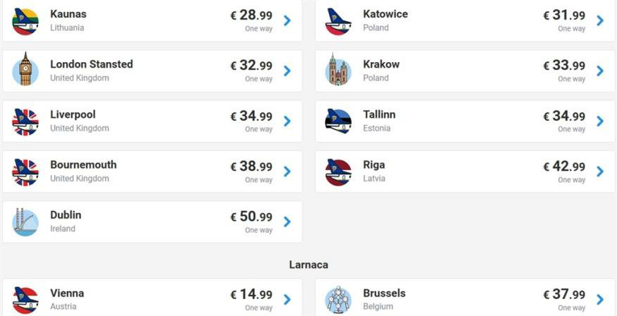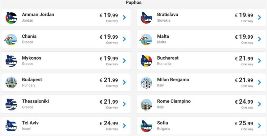 Αεροπορικά εισιτήρια με τιμές που αρχίζουν από €14,99 προς 23 προορισμούς από τα αεροδρόμια Λάρνακας και Πάφου προσφέρει η αεροπορική εταιρεία Ryan Air.