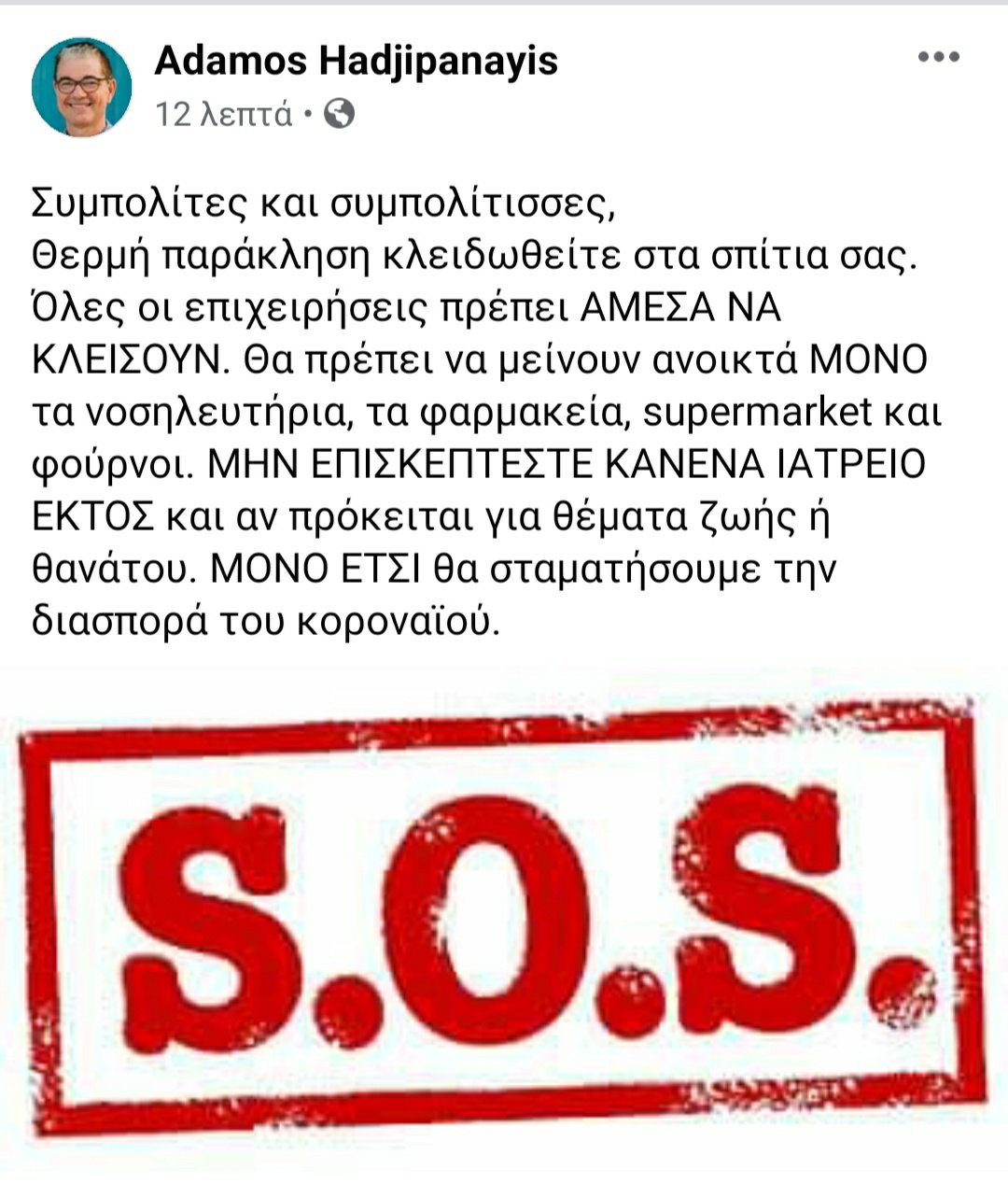 Θερμή παράκληση κλειδωθείτε στα σπίτια σας. Όλες οι επιχειρήσεις πρέπει ΑΜΕΣΑ ΝΑ ΚΛΕΙΣΟΥΝ. Θα πρέπει να μείνουν ανοικτά ΜΟΝΟ τα νοσηλευτήρια, τα φαρμακεία, supermarket και φούρνοι. ΜΗΝ ΕΠΙΣΚΕΠΤΕΣΤΕ ΚΑΝΕΝΑ ΙΑΤΡΕΙΟ ΕΚΤΟΣ και αν πρόκειται για θέματα ζωής ή θανάτου. ΜΟΝΟ ΕΤΣΙ θα σταματήσουμε την διασπορά του κοροναϊού.