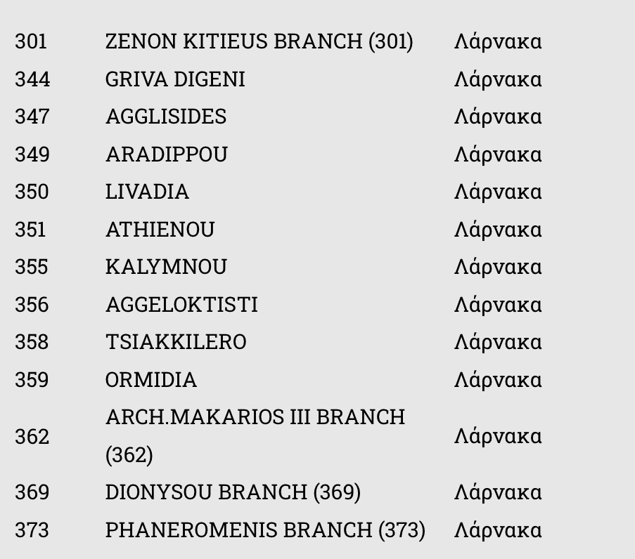 Τα υποκαταστήματα που θα λειτουργούν στη Λάρνακα είναι: